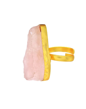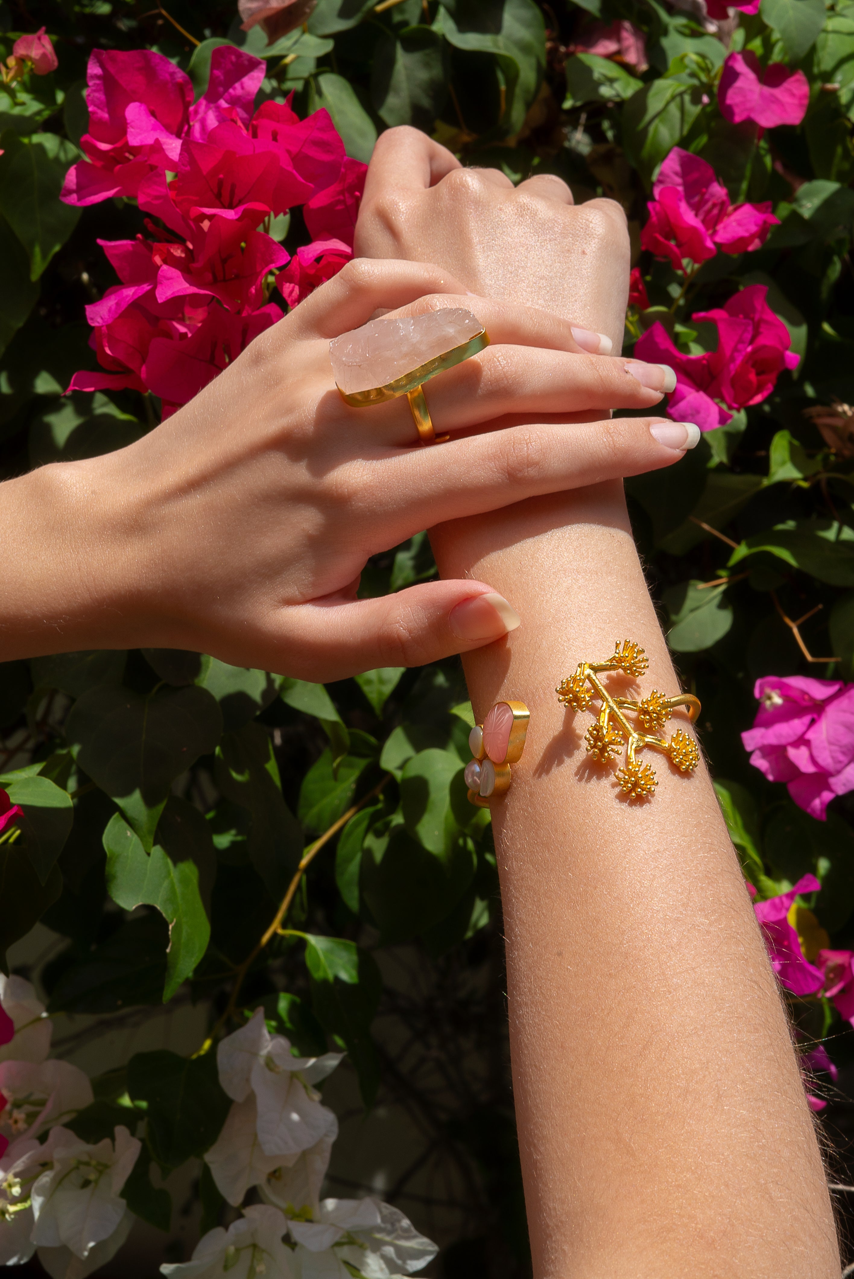 This exquisite ring features a striking arrangement natural gemstones in soft complemented by clusters of lustrous pearls. The elegant design combines different textures within a 18K polished metallic setting, creating a sophisticated yet whimsical accessory perfect for any occasion.