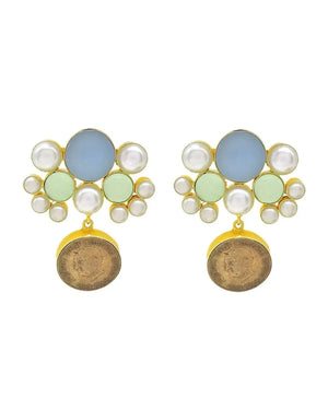 Signature statement earrings in a playful combination of repurposed antique coins and raw natural stones. Perfect for adding a pop of colour to your everyday attire.