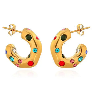 Add a playful touch to your accessories with these colorful gem-studded hoop earrings. Featuring a vibrant array of sparkling gemstones set in a gold-plated finish, these hoops bring life to any outfit. At approximately 2.5 cm in diameter, they are the perfect size for making a statement without being overwhelming. Pair them with solid-colored outfits to let their brilliance shine through, whether for casual outings or semi-formal events.