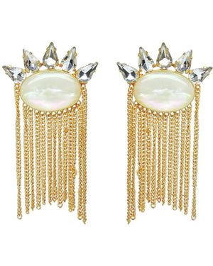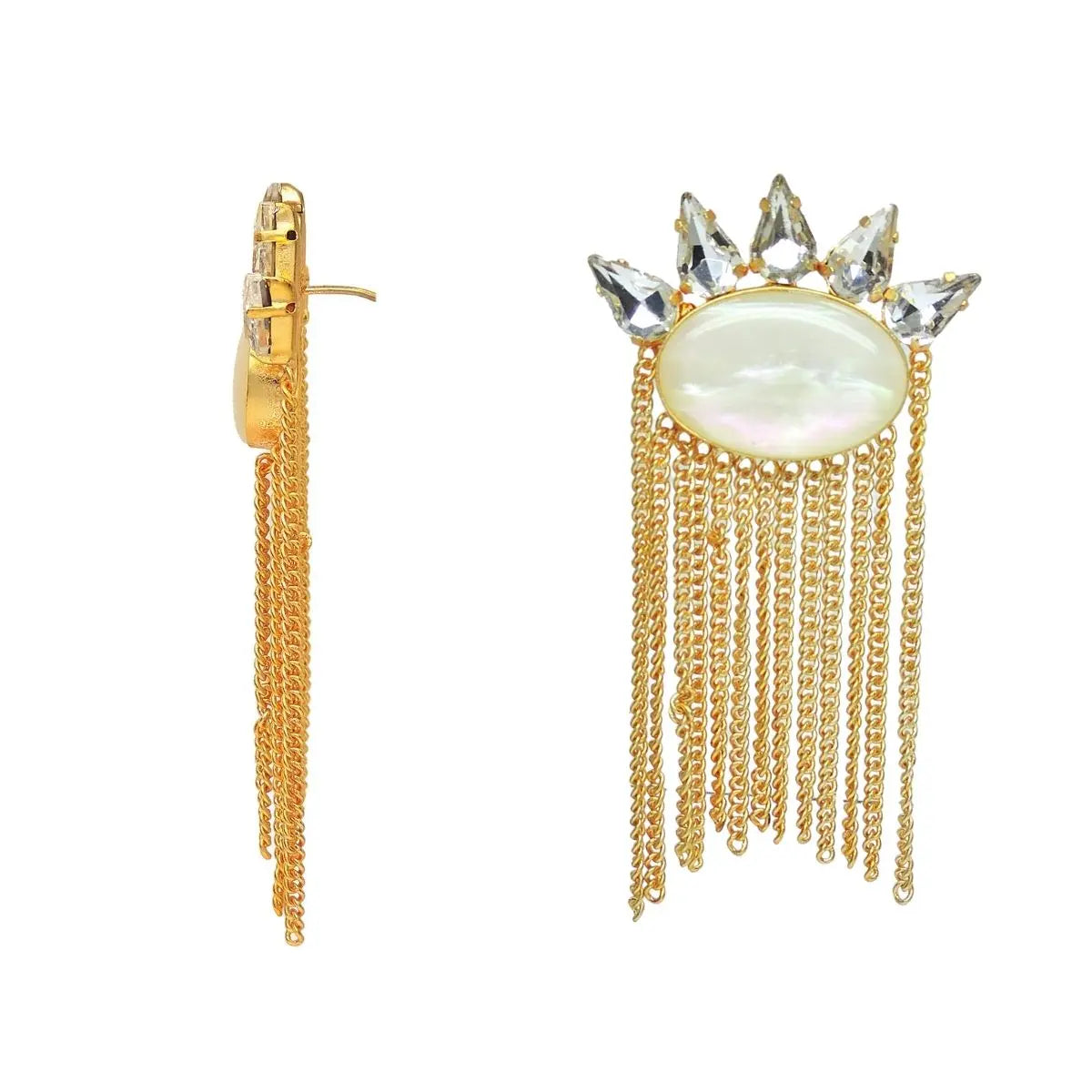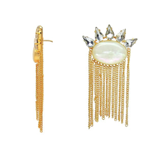 Set a statement in polished ivory with this pearlescent pair. Featuring radiant monalisa stones as its centrepiece, the Blanc Tassel is finished with crystal spikes for an edgy touch. Let it shine on its own and style with a matching cuff for an easy day to night look.