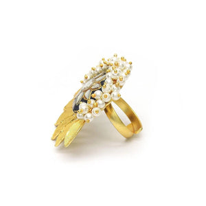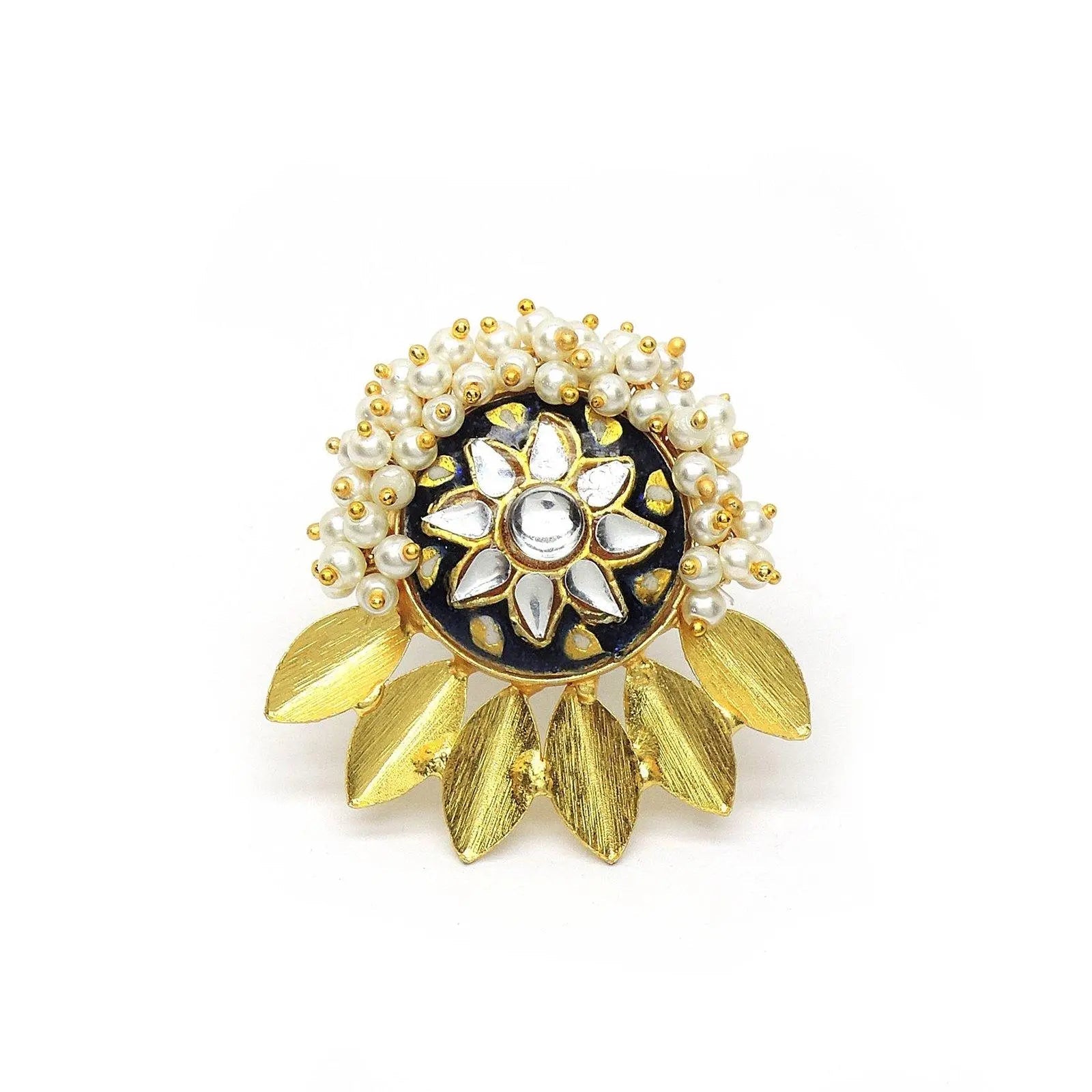 Bold and eclectic, the Calendula Night is perfect for taking with you on evening strolls, clad in gold and midnight blue. Crafted with a round kundan piece, this ring is topped with carved golden feathers for a sun-kissed glow. Style it up with a denim dress for a chic contrast, perfect for taking from day to night.