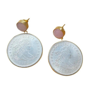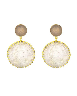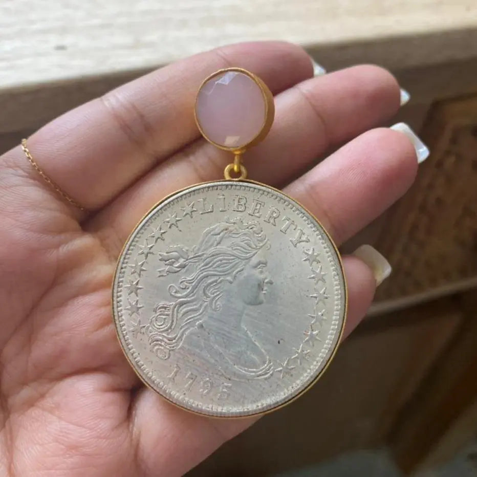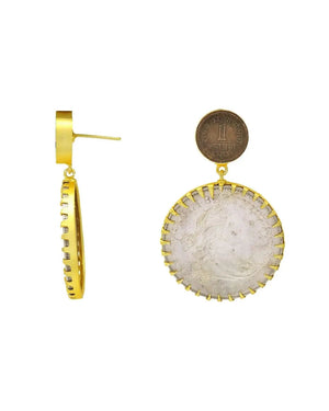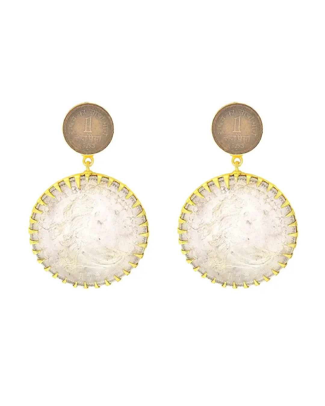 Exuding timeless elegance, this classic plated pair features a silver antique copper coin adorned with rose quartz studs. A vintage take on classic danglers, these earrings exude elegance with every look. Pair with your favourite white dress and sandals for a chic casual look.