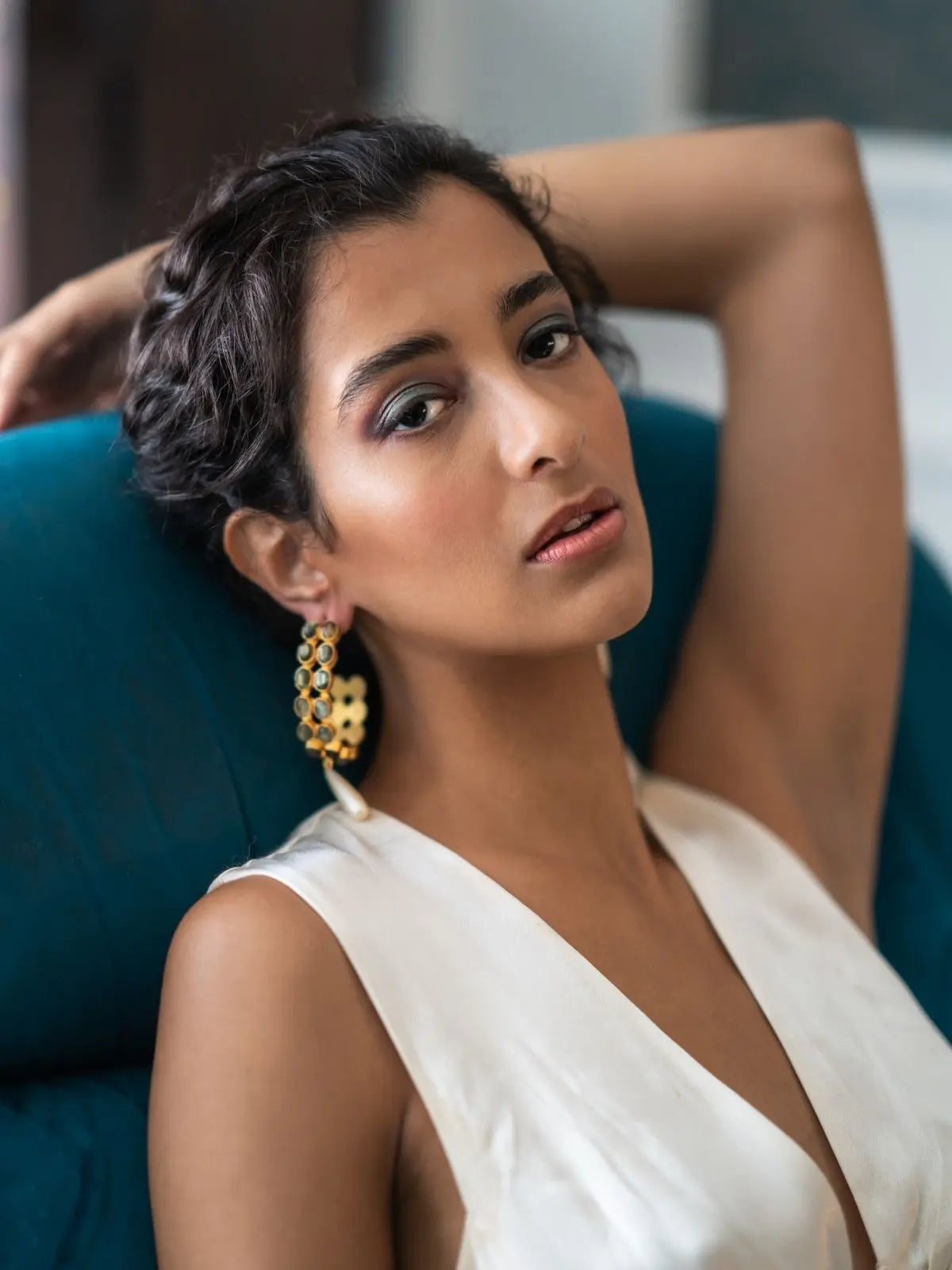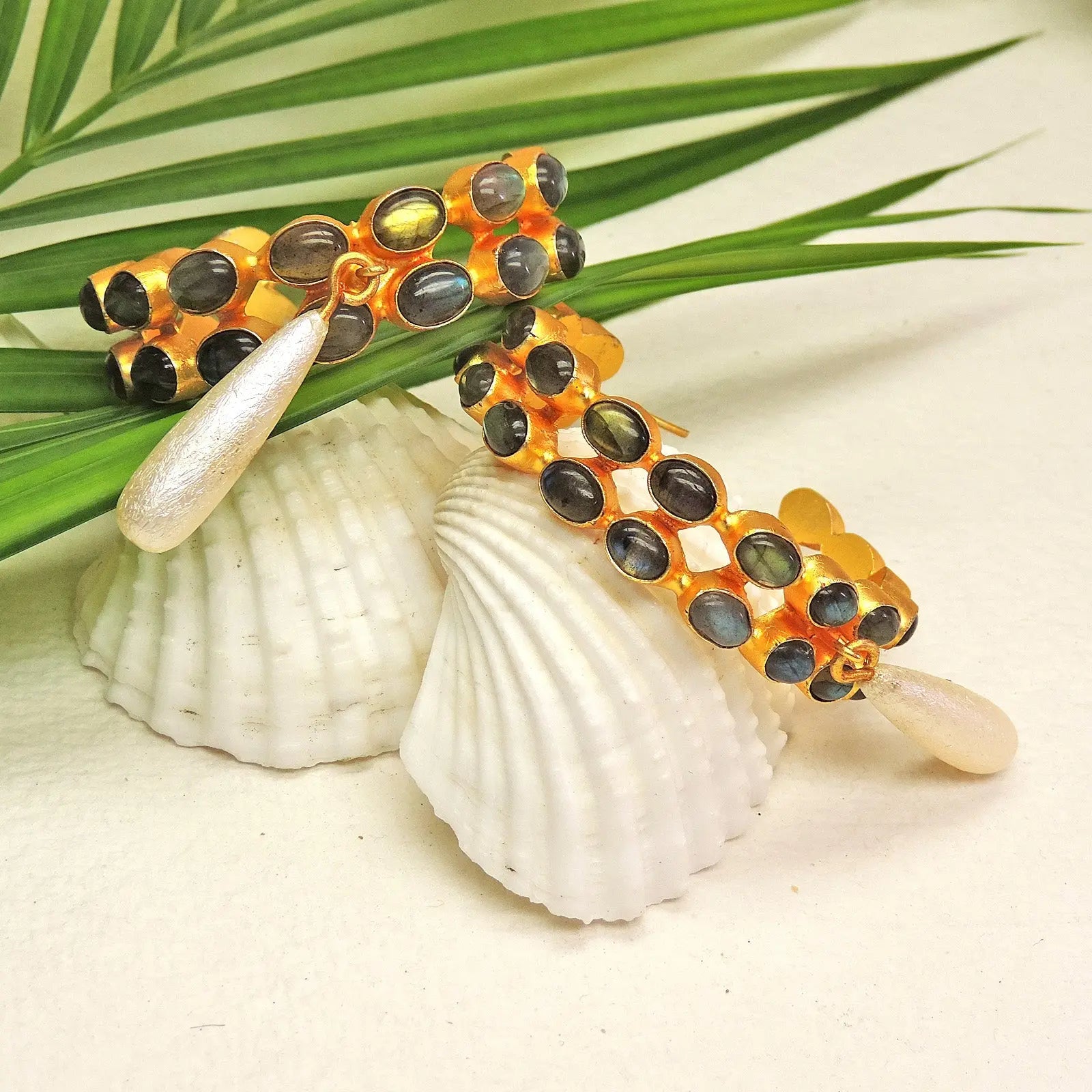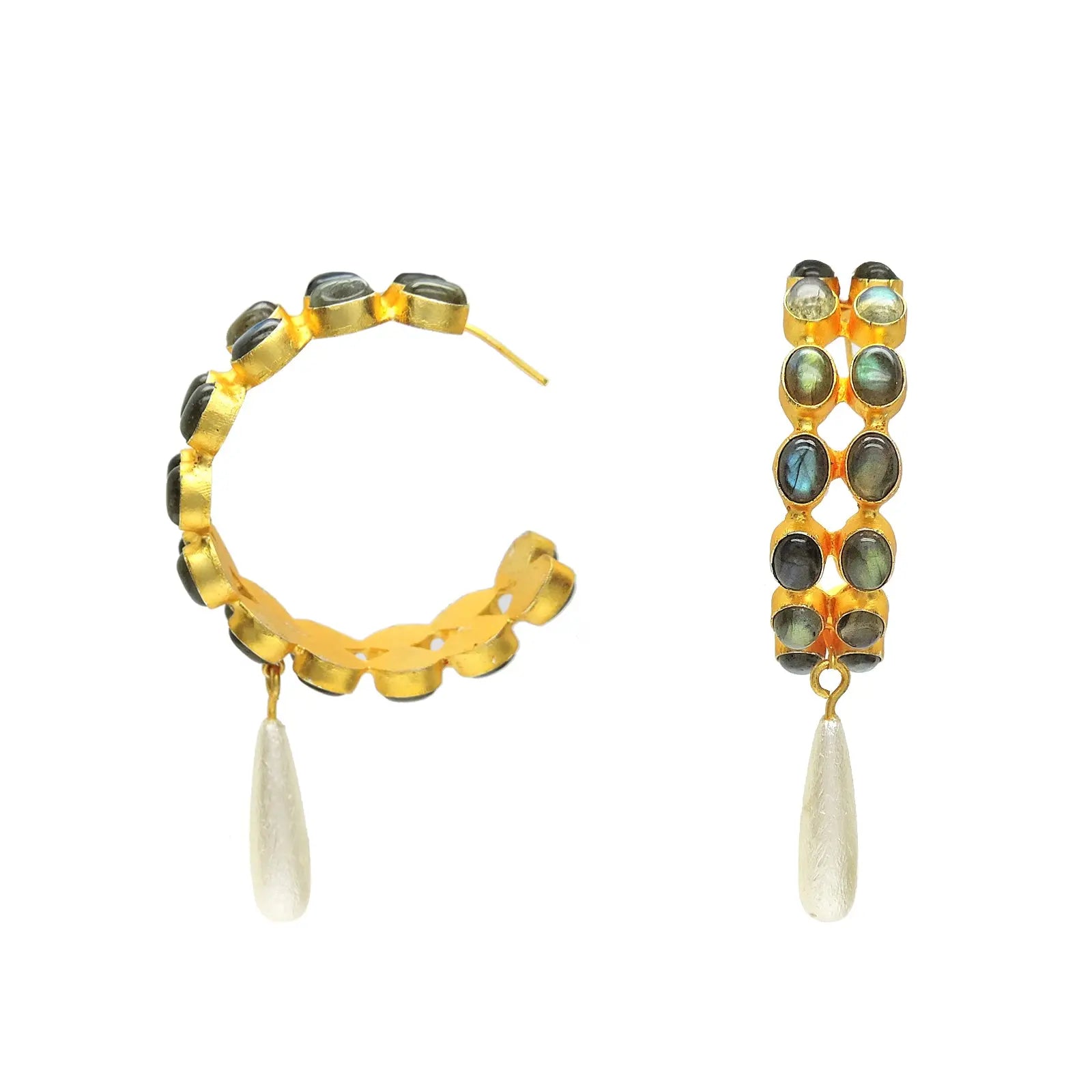 The iconic hoop gets the special treatment in clusters of iridescent labradorite. Set into classic oval shapes, this gilded piece is finished with dangling teardrop pearls for a sophisticated touch. Made for easy, effortless styling, promising to set a bold statement wherever you go.
