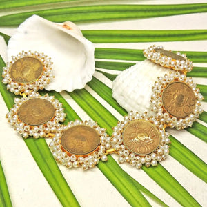 Bloom in vintage with this statement neckpiece, this time in repurposed copper coins. A rustic yet elegant statement on its own, this piece shines radiantly on its own or paired with its matching earrings. An easy go-to favourite for every occasion.