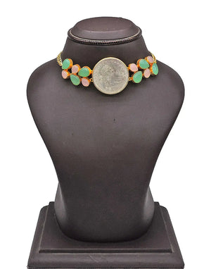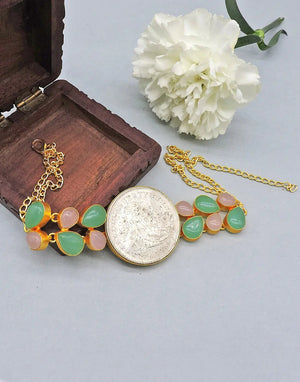 More than just an accessory, this statement necklace is perfect for enveloping yourself in timeless radiance wherever you go. Crafted in 18K gold plated metals and embellished with natural stones, this exquisite piece is a versatile companion that adapts to any occasion and wardrobe.