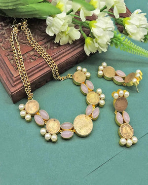 One-of-a-kind statement necklace embellished in repurposed antique coins and natural stones stitched together with strings of pearls. Let it shine on its own or pair with its matching earrings for a chic polished look.