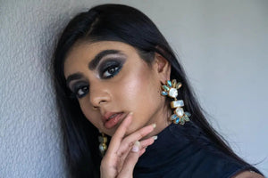Dramatic and eye-catching, these cascading earrings feature a mesmerizing mix of iridescent mother-of-pearl and radiant blue gemstones. Designed in an intricate floral arrangement, they create a bold, avant-garde look that is both glamorous and unique. A must-have for those who love to make a statement with their accessories.