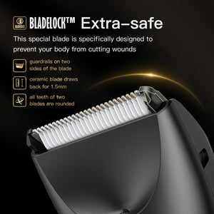 - [Advanced Ceramic Blade] - The pubic hair trimmer for men is equipped with advanced ceramic blades which reduced the risk of cuts, fewer pulled hairs, and skin irritation. To minimize irritation, always shave your balls with a clean electric razor on clean, wet skin in the direction of hair growth and while using a lubricant.