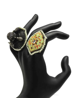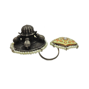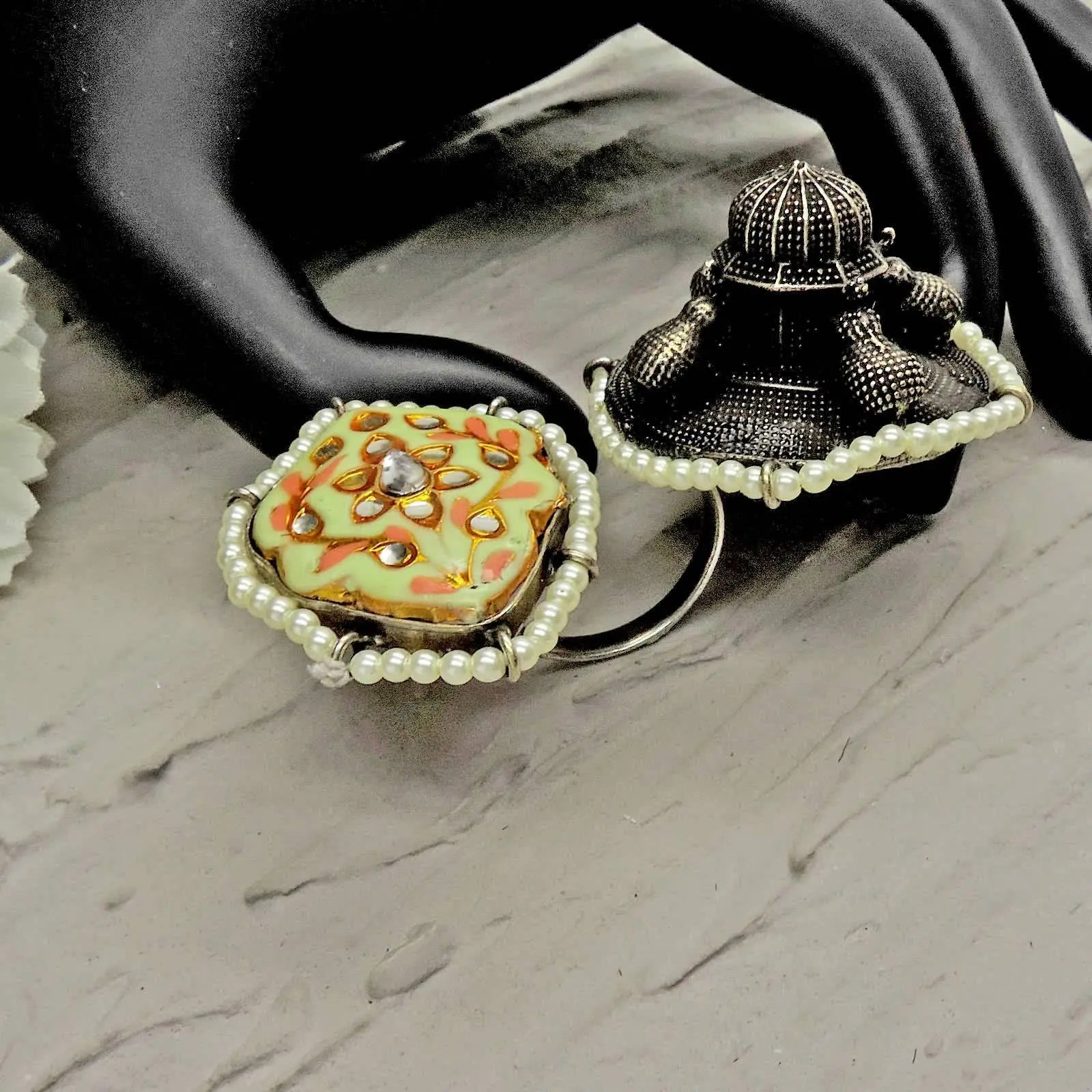 A Dori take on traditional tikdaa jewellery, this bright illusion ring features a kundan piece enamelled in lemon yellow and an antique inspired block. Crowned with miniature pearls, this ring is a playful spin on a classic. Pair with matching thappa earrings for a full on rustic look, or a statement necklace for all out glam in the evening.