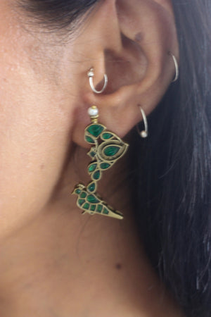 Emerald enamel bird danglers with geometric detailing, a fusion of traditional meenakari and modern silhouettes.
