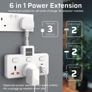 - Comprehensive Connectivity extension plug: Seamlessly power a home office or entertainment setup with 2 AC outlet extension sockets, 2 Type-C, and 2 USB-A ports, providing an all-in-one charging solution for a variety of electronics.