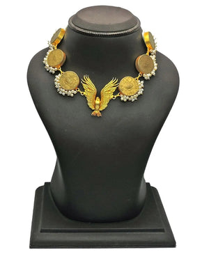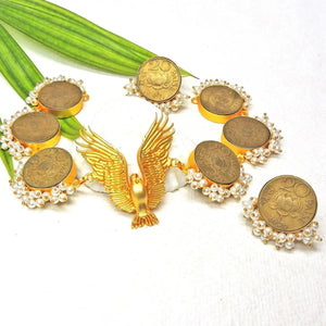 Our signature Bloom choker, affixed with the majestic falcon. The Falcon Bloom is a statement neckpiece for special occasions and beyond. Crafted with repurposed vintage coins and pearls for a golden look you won't soon forget.