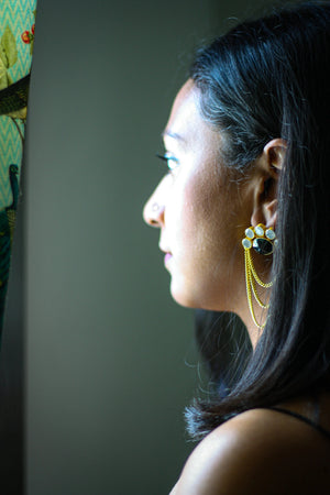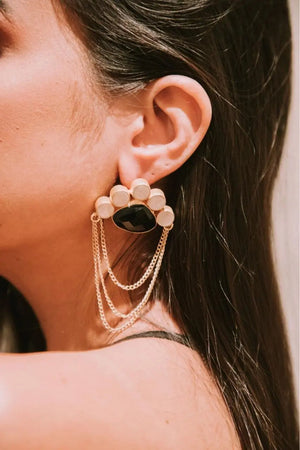 Edgy meets elegance in these unique earrings featuring a bold black gemstone surrounded by soft white stones. Delicate cascading gold chains add movement and drama, making these earrings a perfect statement piece for evening wear.