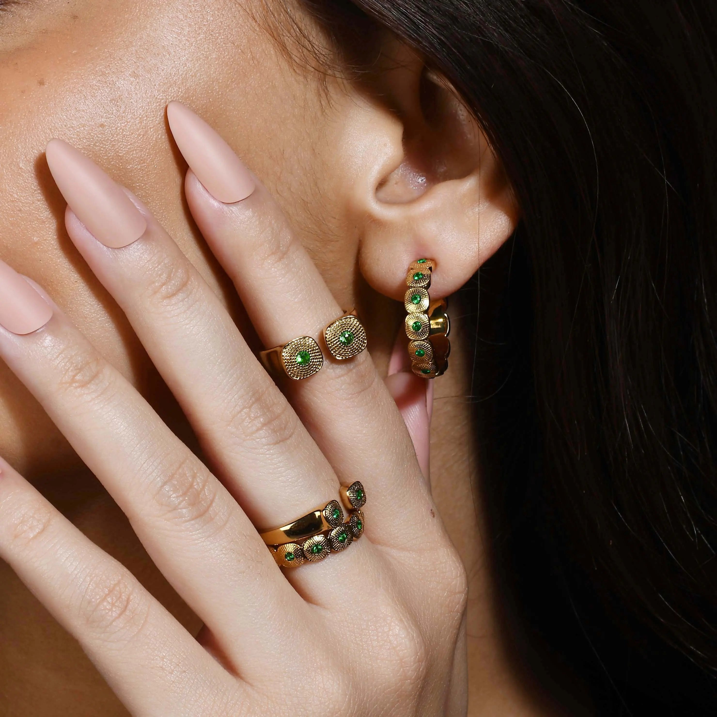 Awe your audience with this Green Gem Ring. Sparkling green zircon decorate the granulated surface of this beauty, which is crafted with gold-plated recycled metal. A jewellery must-have for any collection!