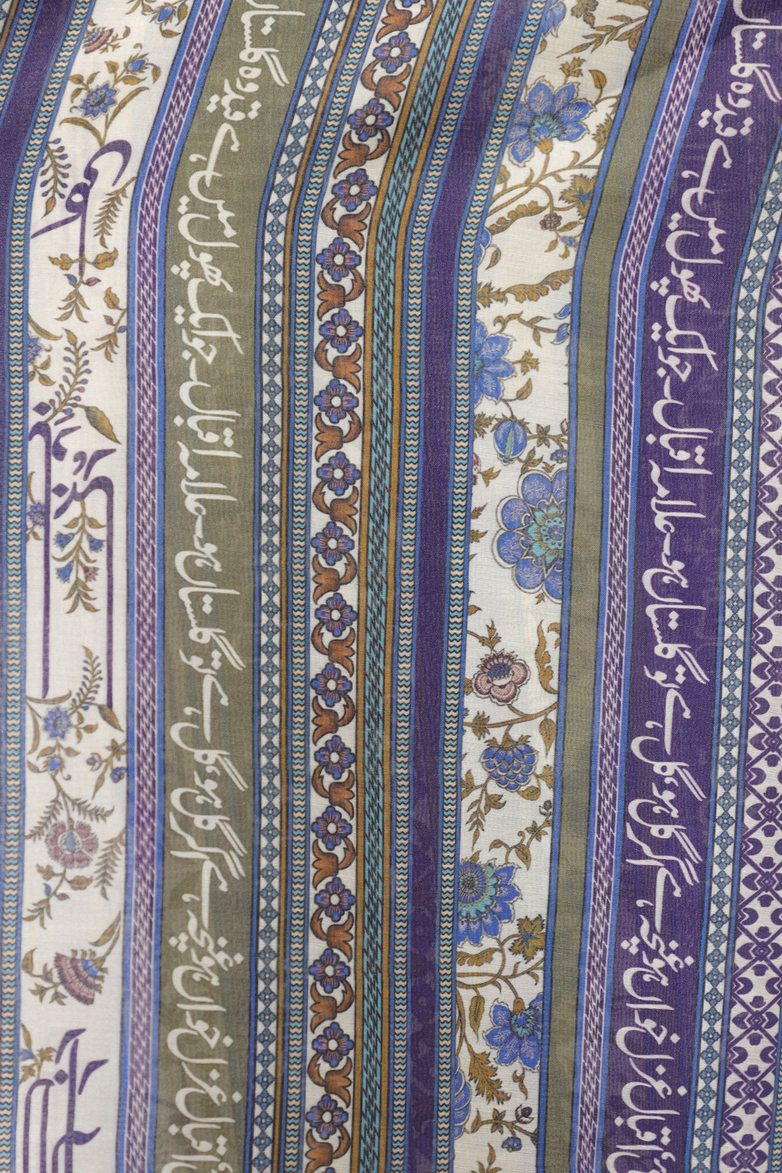 Gulistan Stole features a printed floral, striped pattern with words such as Phool (flower), Gulistan (rose garden), Kali (bud), and motivational poetry inspired by Allama Iqbal and Kaifi Azmi.