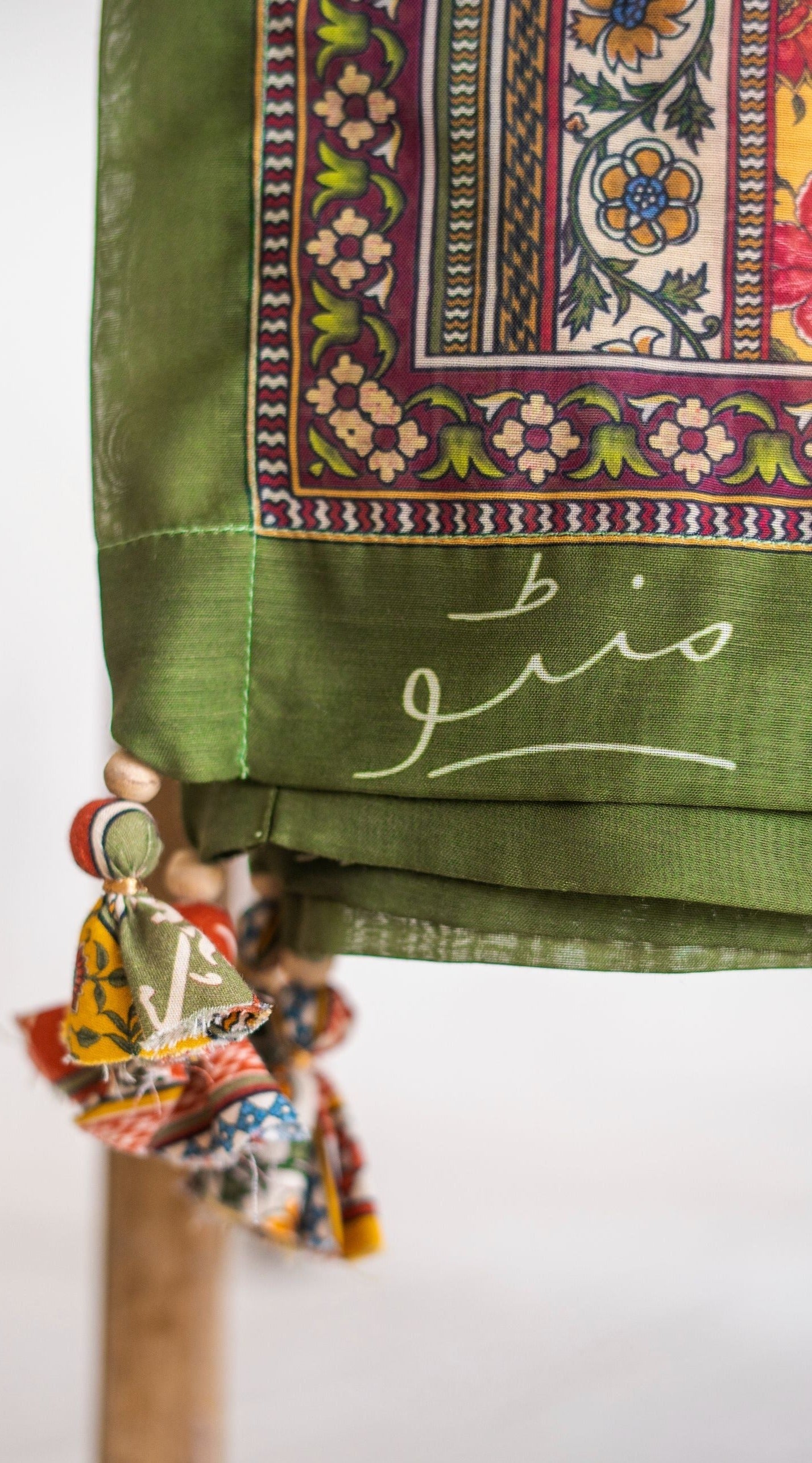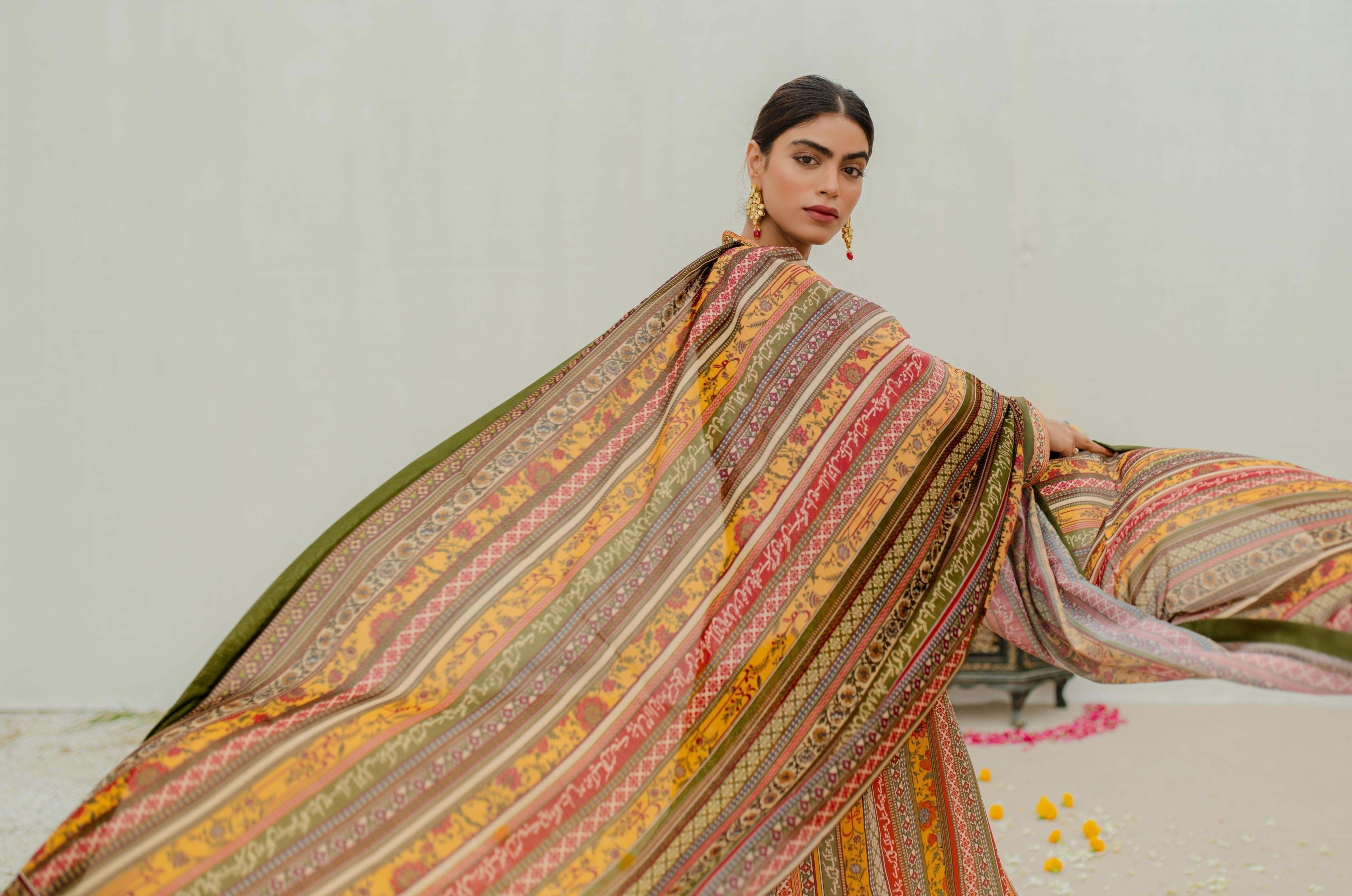 Gulistan Stole features a printed floral, striped pattern with words such as Phool (flower), Gulistan (rose garden), Kali (bud), and motivational poetry inspired by Allama Iqbal and Kaifi Azmi.