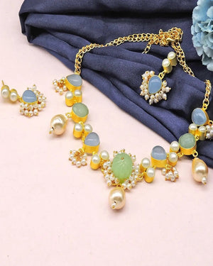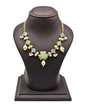 Handcrafted statement necklace adorned in monalisa and pearls for a bold burst of colour. Let it shine on its own or style with matching earrings for a sumptuous day-to-night look.