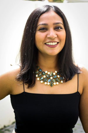 Bold yet effortlessly graceful, this striking necklace is a masterpiece of rich textures and exquisite craftsmanship. Featuring lustrous labradorite gemstones framed in gold and interspersed with radiant pearls, it captures the essence of opulence and organic beauty. A true statement piece designed to elevate any look with its enchanting allure.