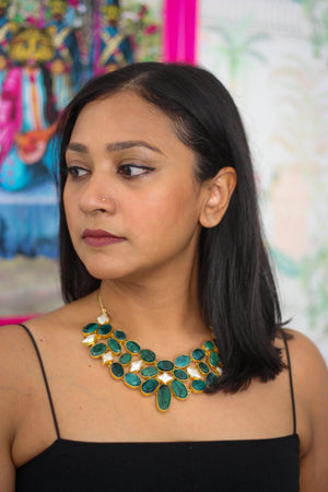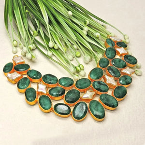 A luxurious display of deep green and gold, this choker necklace is a true embodiment of royal sophistication. Oval-cut emerald-green stones are set in a golden frame, interspersed with uniquely shaped pearl-like accents that add depth and dimension to the piece. Whether paired with a saree, an evening gown, or a fusion outfit, this necklace commands attention, celebrating the timeless allure of rich, jewel-toned elegance.