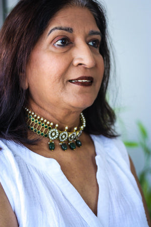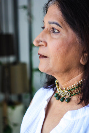 Emerald-stringed choker with pearl-laced kundan panels—classic bridal mood.