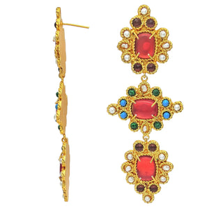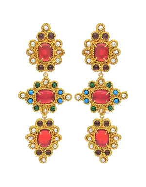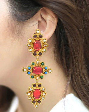 Our homage to lavish vintage charms of the past, the Inaya glistens in clusters of vibrant glass stones. Coloured in bright blues, reds and greens, the Inaya takes a bow in gold, promising an unforgettable look. Pair with a classic LBD and let this pair take centrestage wherever you go.
