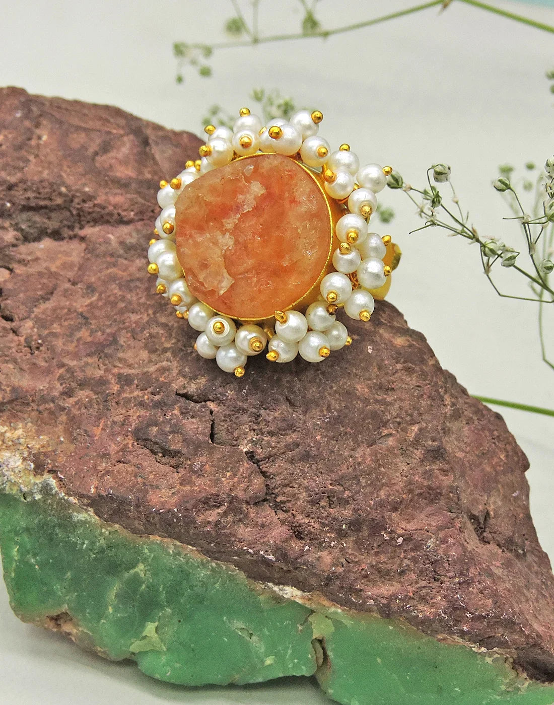 This exquisite ring features a striking arrangement natural gemstones in soft complemented by clusters of lustrous pearls. The elegant design combines different textures within a 18K polished metallic setting, creating a sophisticated yet whimsical accessory perfect for any occasion.