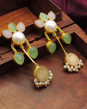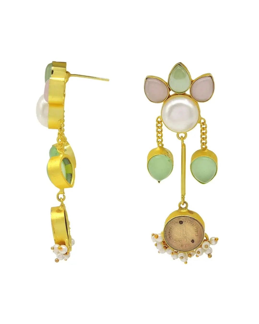 Heirloom-inspired statement earrings embellished in repurposed antique coins, raw natural stones and pearls. The perfect day-to-night pair.