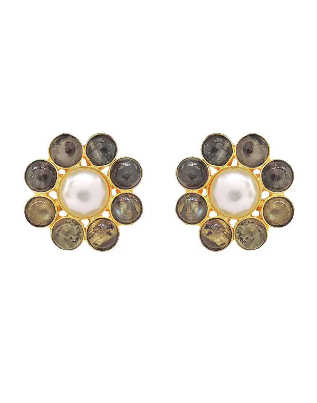 Experience the allure of our Floral Necklace, crafted from Labradorite and Pearl with a striking olive green accent. Each earring showcases a small flower-shaped design with gold detailing and a pearl at the center, highlighting the natural iridescence of the labradorite. The sophisticated olive green tones make these earrings a perfect blend of natural beauty and refined elegance.