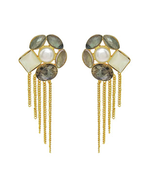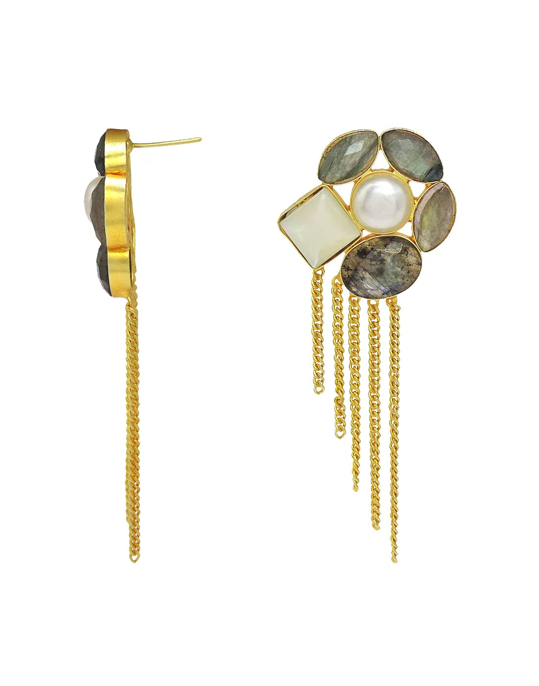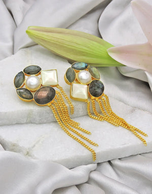 Handcrafted statement earrings featuring a striking design of natural stones set in a 18K gold plated frame. Designed to grab attention, these earrings add a touch of sophistication and colour to any ensemble. Nickel and tarnish free, perfect for all occasion wear.