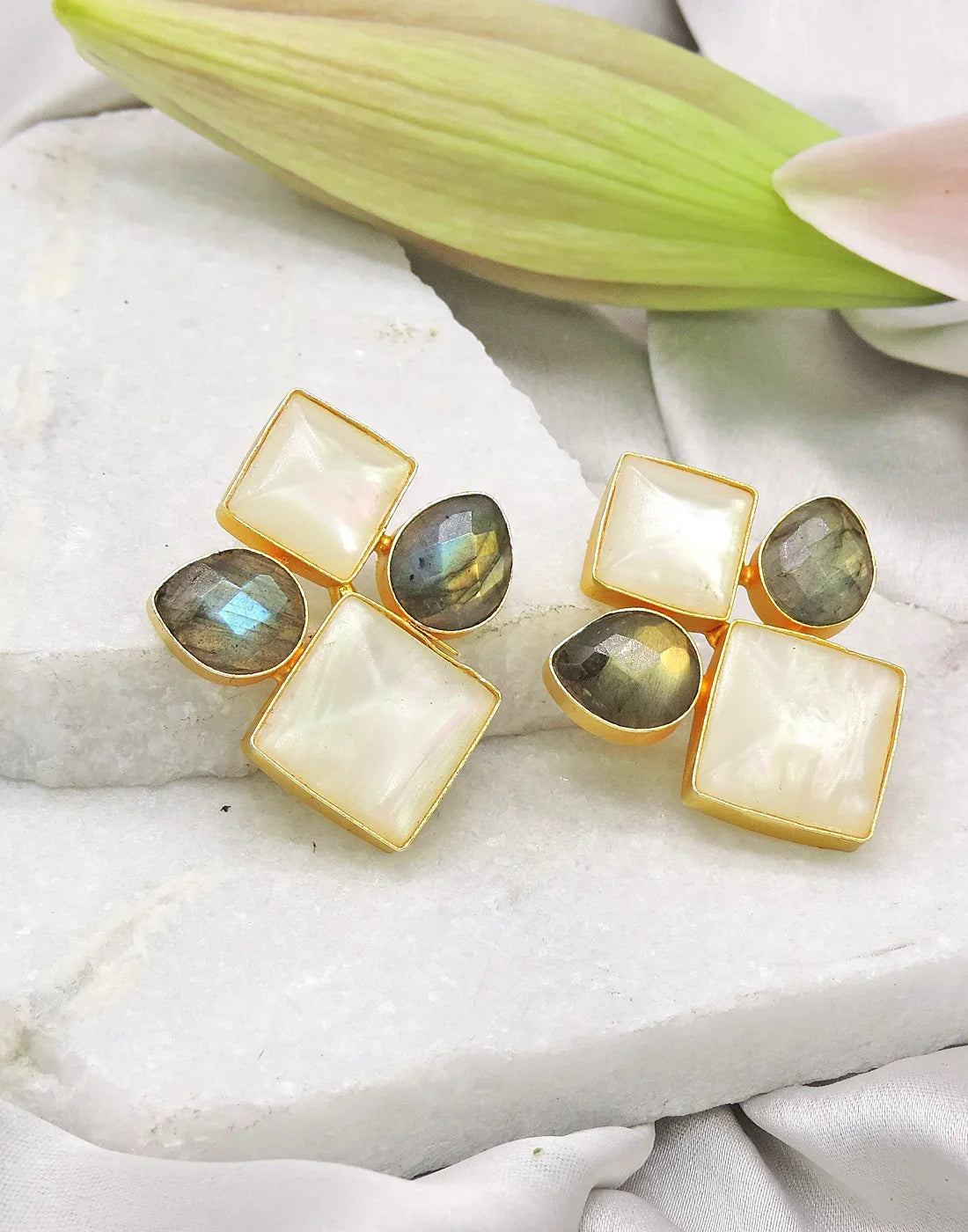 Handcrafted statement earrings featuring a striking design of natural stones set in a 18K gold plated frame. Designed to grab attention, these earrings add a touch of sophistication and colour to any ensemble. Nickel and tarnish free, perfect for all occasion wear.