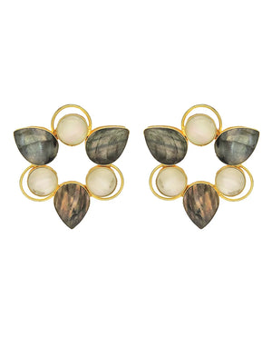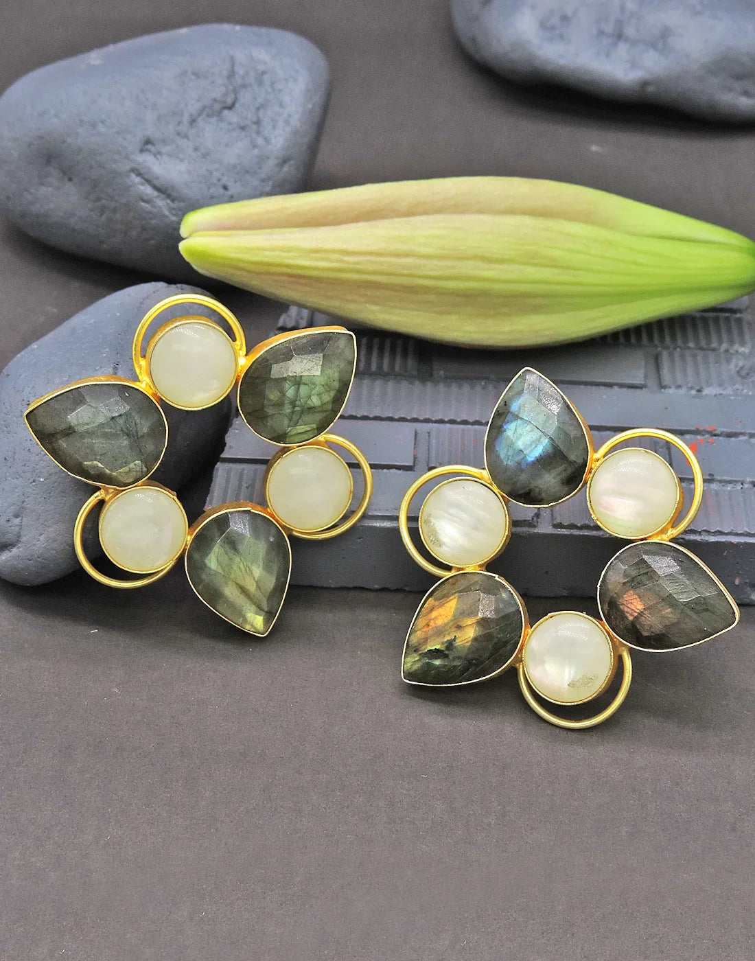 Handcrafted statement earrings featuring a striking design of natural stones set in a 18K gold plated frame. Designed to grab attention, these earrings add a touch of sophistication and colour to any ensemble. Nickel and tarnish free, perfect for all occasion wear.