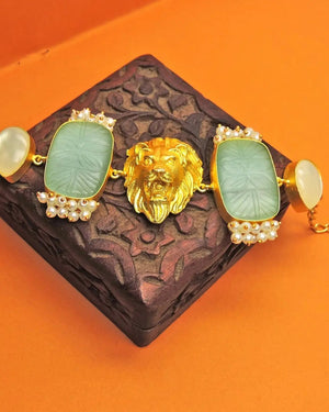 One-of-a-kind chain bracelet plated in gold and embellished with clusters of natural stones. Finished with hand-stitched pearls for a pop of brilliance.