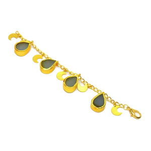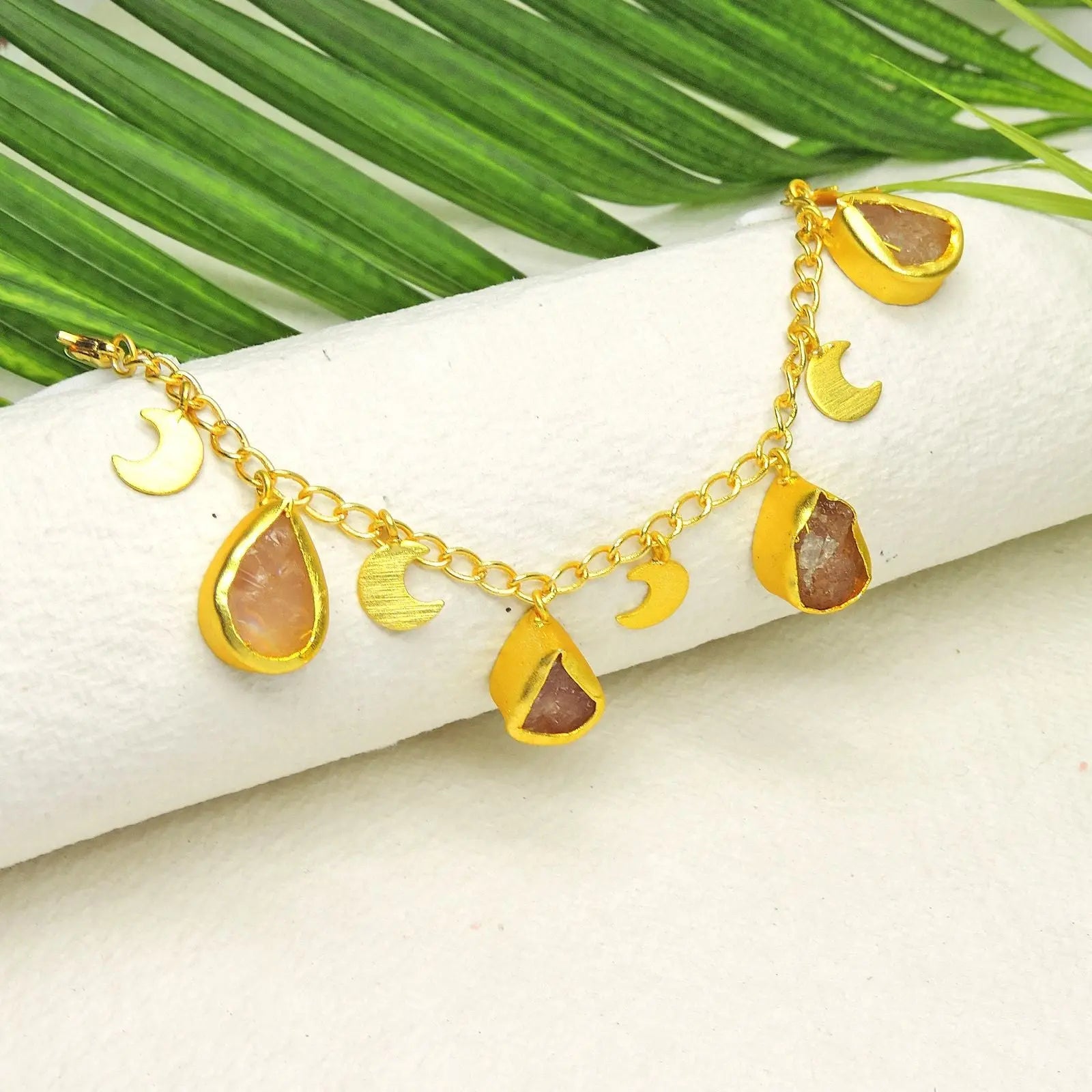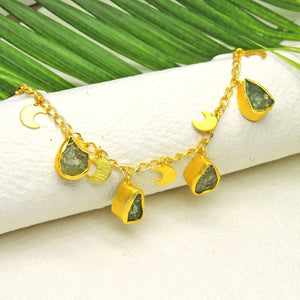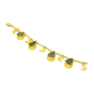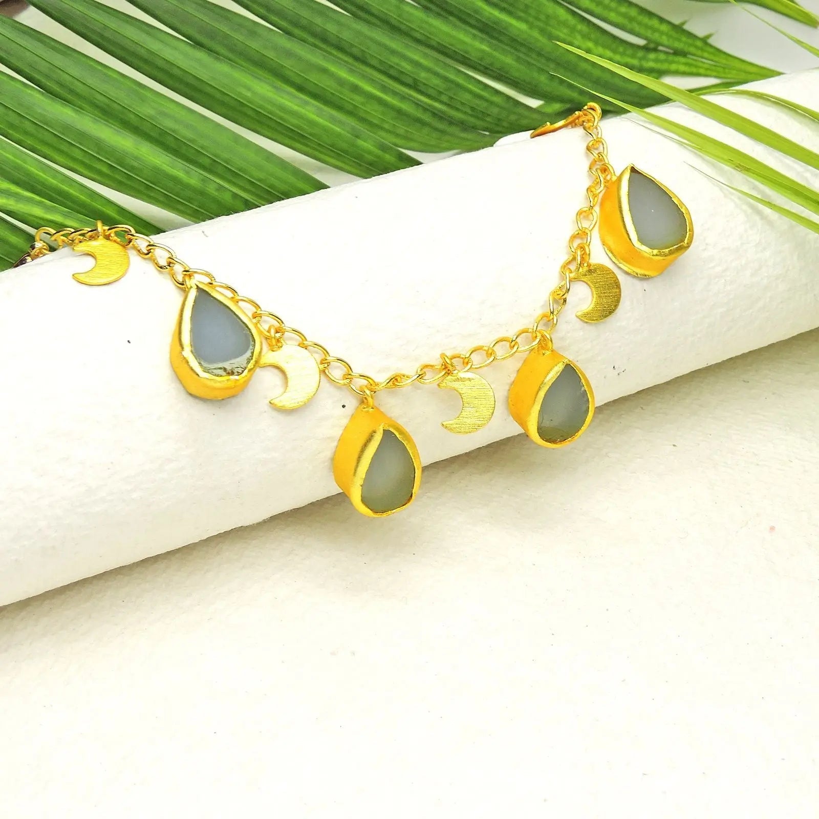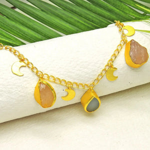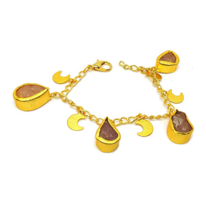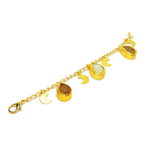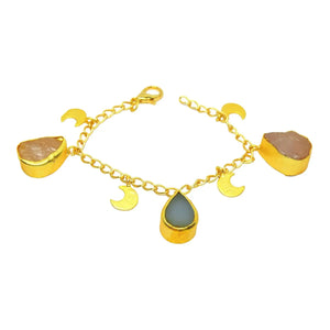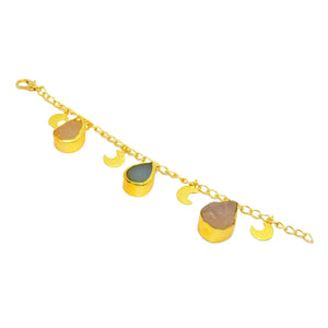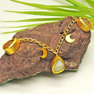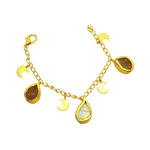 The perfect everyday accessory. The Lunar wears as a chain bracelet set in raw natural stones. Comes in five different colorways for all looks and moods: Mint in amazonite and jasper, Sky in blue onyx and citrine, Jasper, Blue Onyx and Fluorite.