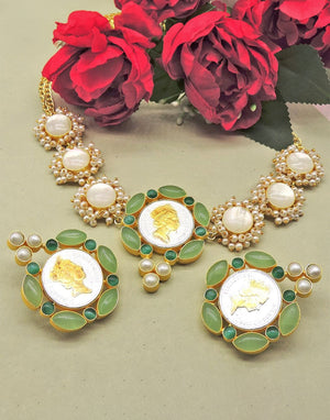A Dori signature, this reinvented statement necklace is embellished with repurposed antique coins, vibrant monalisa and pearls. Crafted to match any outfit and occasion, style this piece with matching earrings or let it shine on its own for an unforgettable glam look.