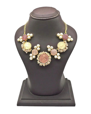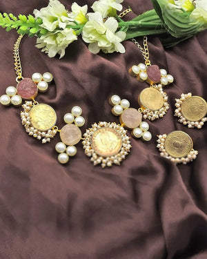 One-of-a-kind statement necklace embellished in repurposed antique coins and natural stones stitched together with strings of pearls. Let it shine on its own or pair with its matching earrings for a chic polished look.