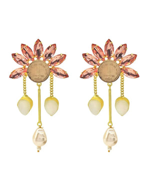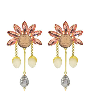 Floral statement earrings embellished in repurposed antique coins, rose-tinted crystals and pearls. The perfect day-to-night pair.