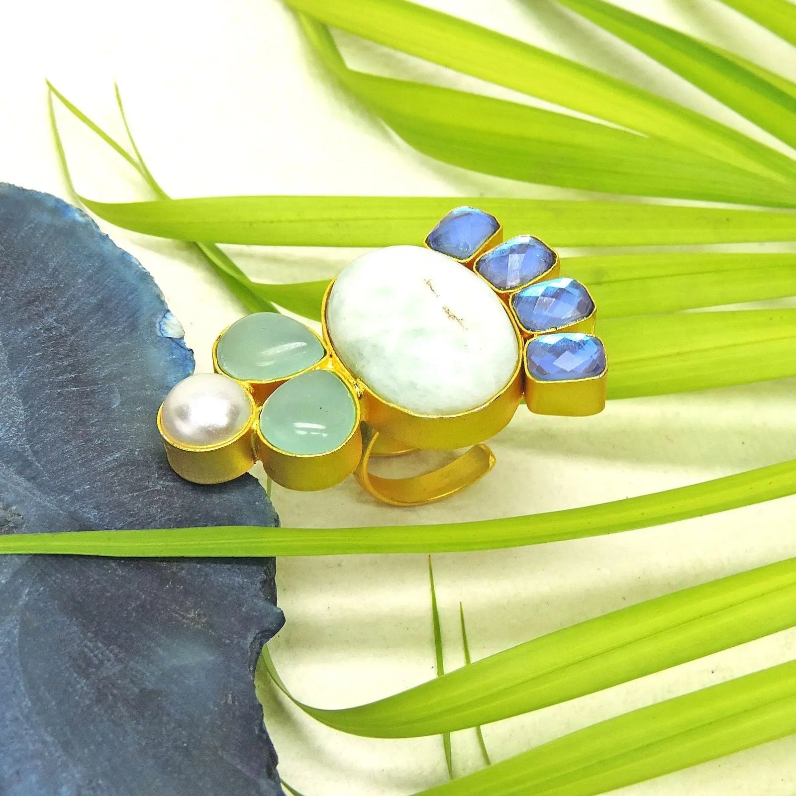 A Dori signature piece, the Penelope Ring features clusters of ocean-hued stones for a refreshing pop of colour. Style it with matching statement earrings for an effortless daytime look.