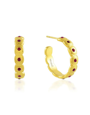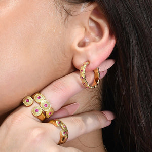 Captivate with these sustainable gold plated hoops featuring a honeycomb texture and eye-catching pink gems. Lovingly handcrafted from recycled metals, the dazzling statement earrings add eco-chic glamour to any outfit. An essential accessory for the stylish fashionista.