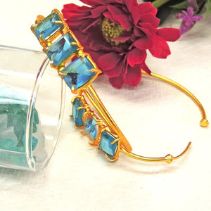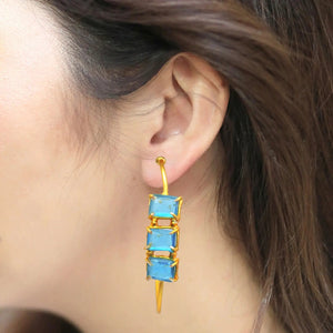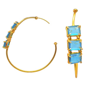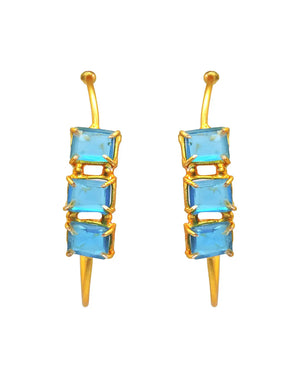 A fun twist to the classic silhouette of a hoop, the Rabia shines in gold and embellished celestial blue stones. A lightweight statement piece, the Rabia is perfect for dressing it up during the day and at night, paired with an equally alluring neck piece.