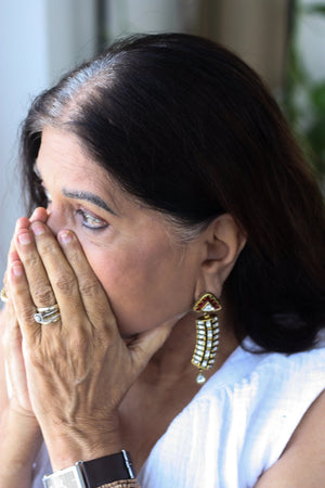 A painted arch stacked with kundan tiles—sleek lines, festive heart.