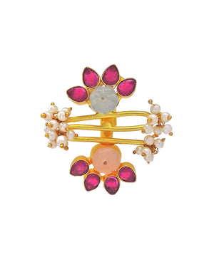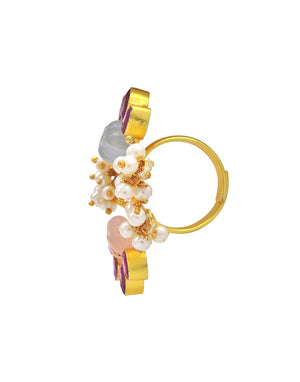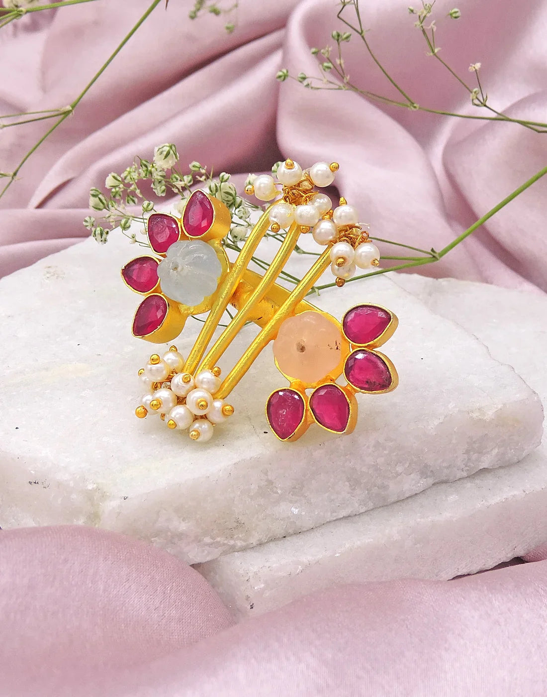This exquisite ring features a striking arrangement natural gemstones in soft complemented by clusters of lustrous pearls. The elegant design combines different textures within a 18K polished metallic setting, creating a sophisticated yet whimsical accessory perfect for any occasion.
