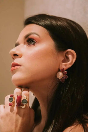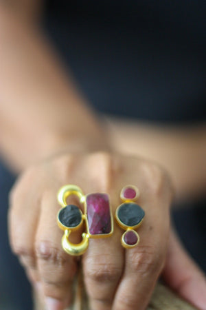 A statement of strength and artistry, this striking ring showcases an eclectic mix of bold red, black, and gold elements. With its geometric composition and textured details, it’s a daring piece that exudes confidence and contemporary elegance, making it an unmissable addition to your jewelry collection.