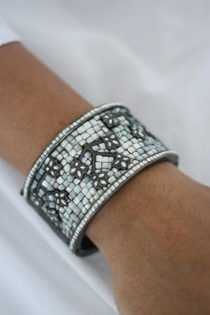 Iridescent tile-work framed in antique silver—soft shimmer with serious presence.