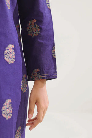 The neckline has a refined slit design with minimal detailing, giving the outfit a balanced blend of traditional finesse and contemporary sophistication. Full-length sleeves further elevate the luxurious feel of the fabric, while the smooth jacquard texture adds richness to every movement.