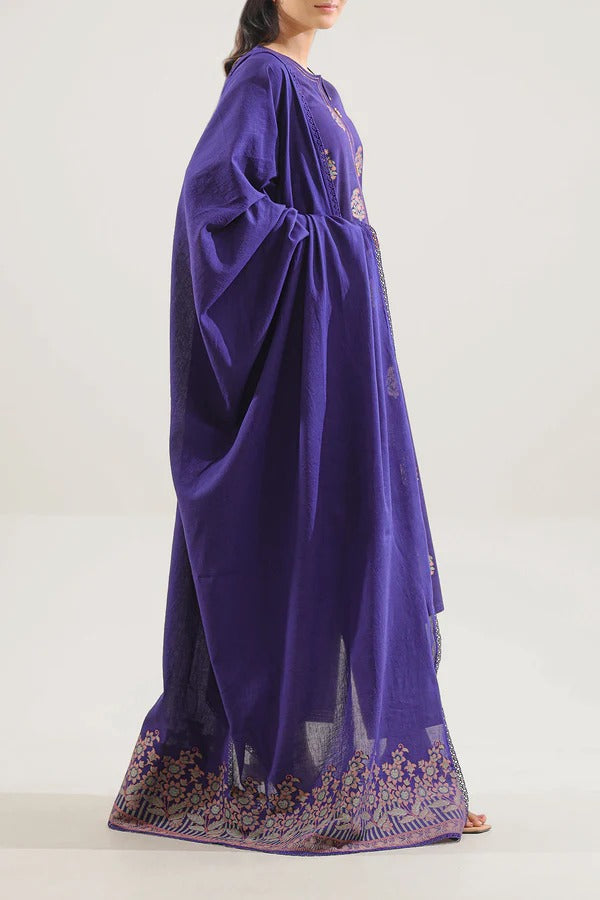 To complete the trio, this suit includes a Premium Dyed Cambric Trouser (2.5m), stitched from soft yet durable winter-friendly cambric. The trouser fabric ensures comfort, smoothness, and flexibility, making it suitable for long wear during colder months. Its deep royal blue shade aligns perfectly with the shirt and dupatta, creating a seamless, polished appearance from head to toe.