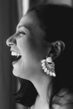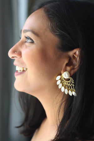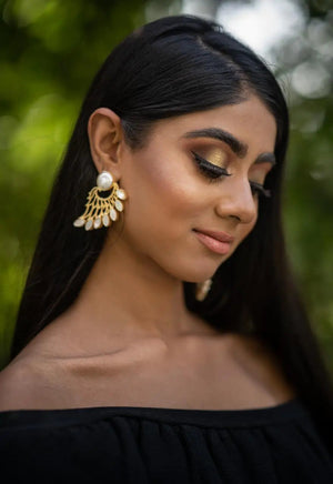 Elevate your elegance with these exquisite gold-plated statement earrings featuring intricate fan-like detailing adorned with lustrous pearls. The perfect blend of tradition and contemporary design, these earrings add sophistication to any outfit, making them ideal for weddings, festive occasions, or a night out.