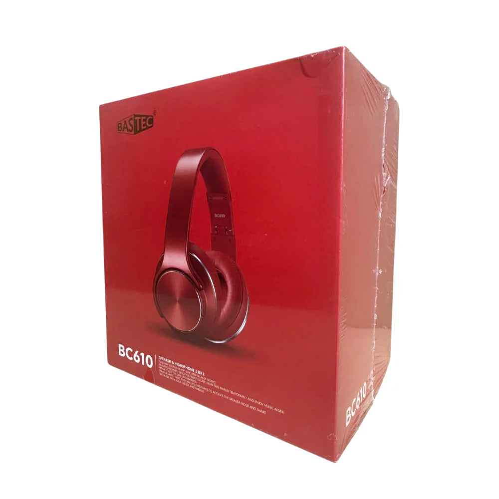 2-in-1 wireless Bluetooth headphones in red color, an innovative headphone with a speaker from Bastic BC610. It can be used as headphones or as a speaker without the need to connect to wires. Its battery provides long hours of listening to music and audio clips, and it is distinguished by its excellent sound quality and comfortable design.